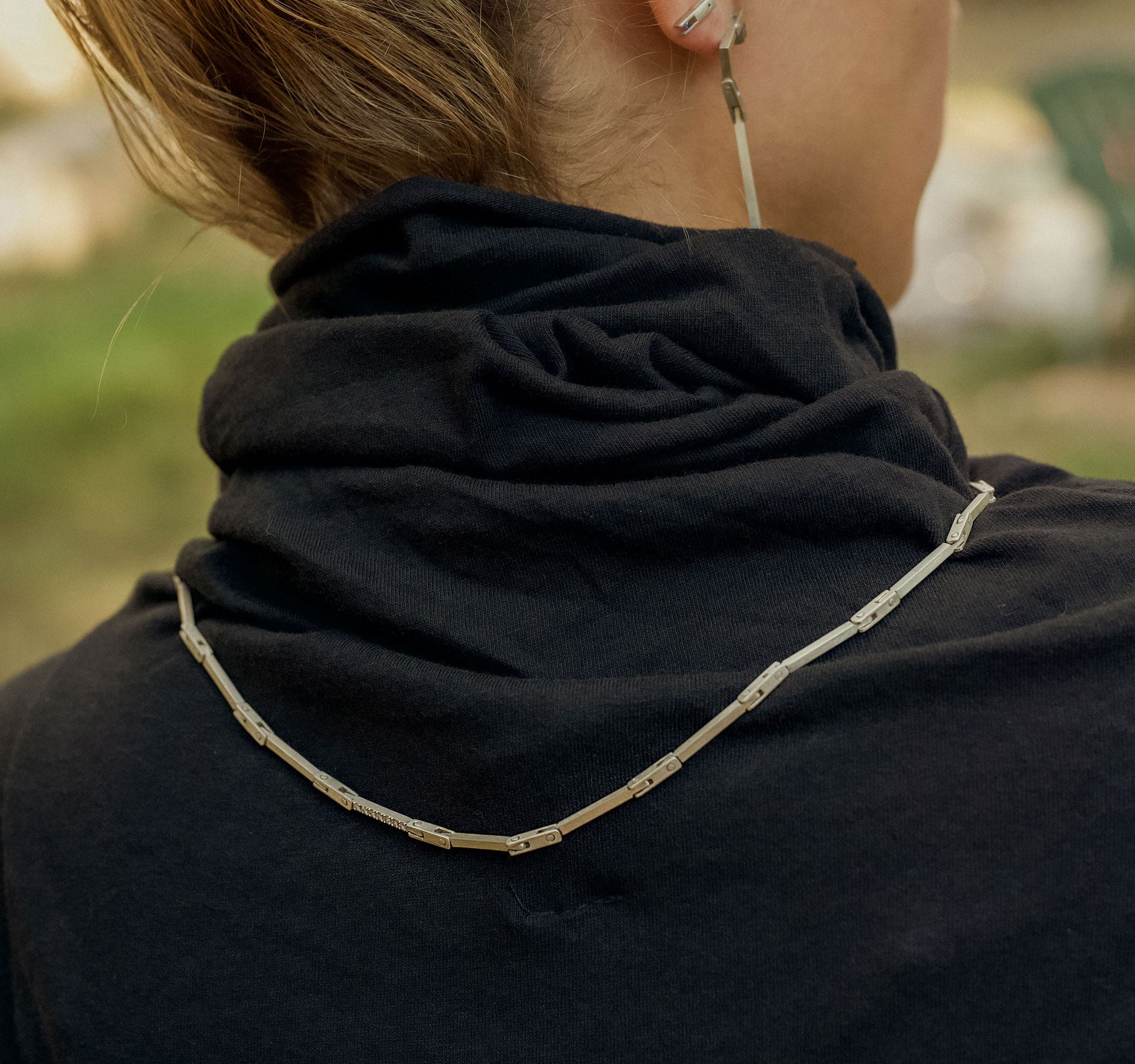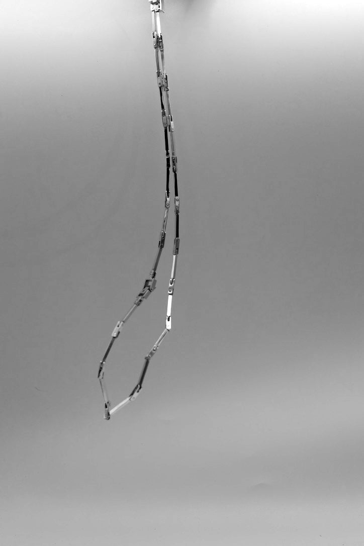 FLOW.STONE is a multi-link necklace of the aBrazg's unique elements connected to long bar pieces with a pavé stone setting.