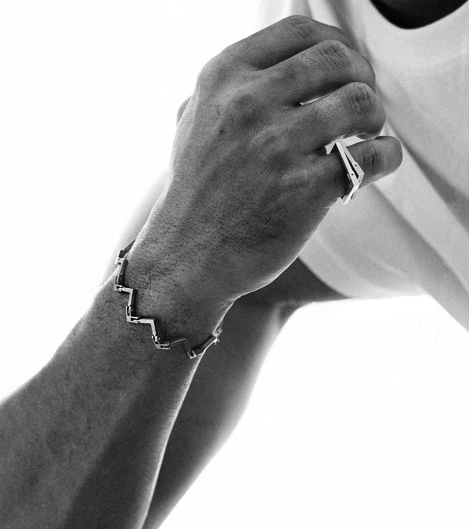 Multi-edge structured bracelet. This statement bracelet features a geometric design composed of angular, interlinked elements. The clean geometric lines create a contemporary and minimalist aesthetic. This bracelet wraps comfortably around the wrist, showcasing its architectural style.