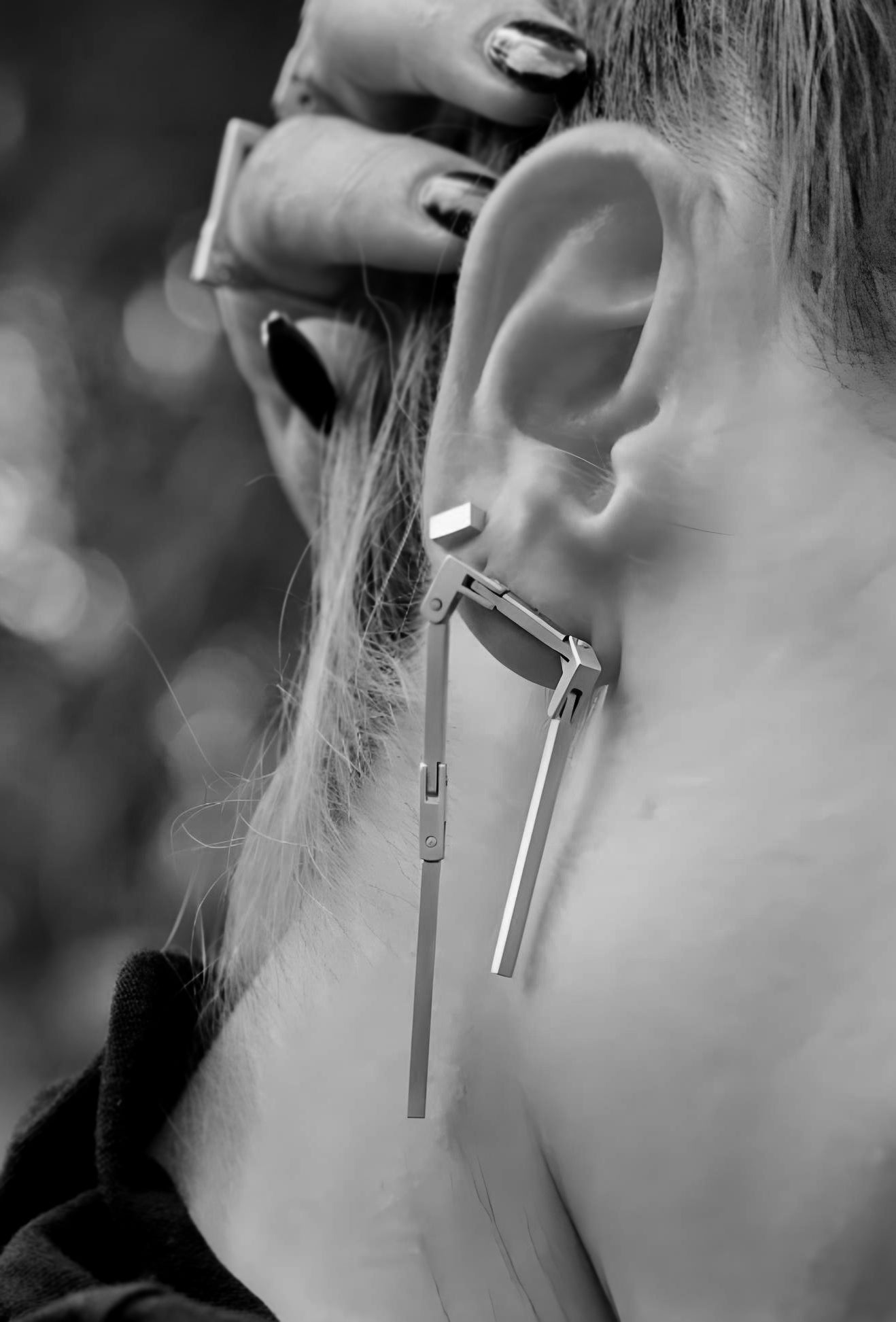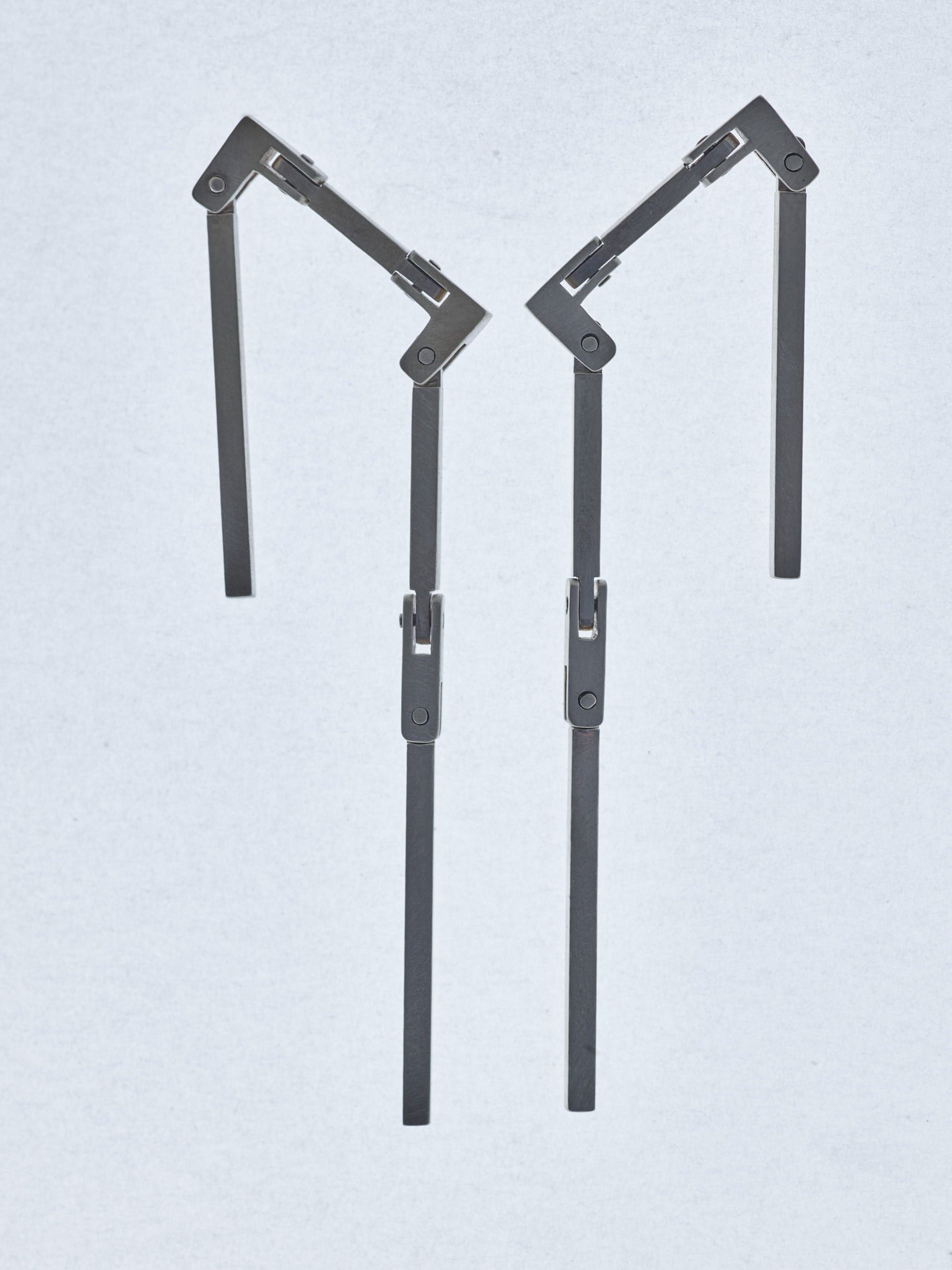 Stone set element links connected to bar pieces that create a long moving earring. Constructed by its architectural elements, this earring flows with constant movement and a subtle sparkle.